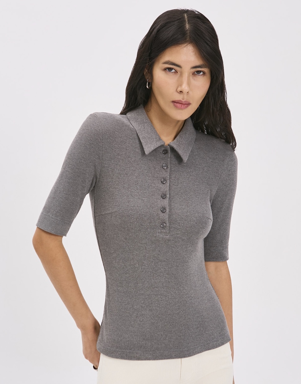 Футболка прилегающего силуэта с втачным рукавом. Застежка-поло на прорезные петли и пуговицы.